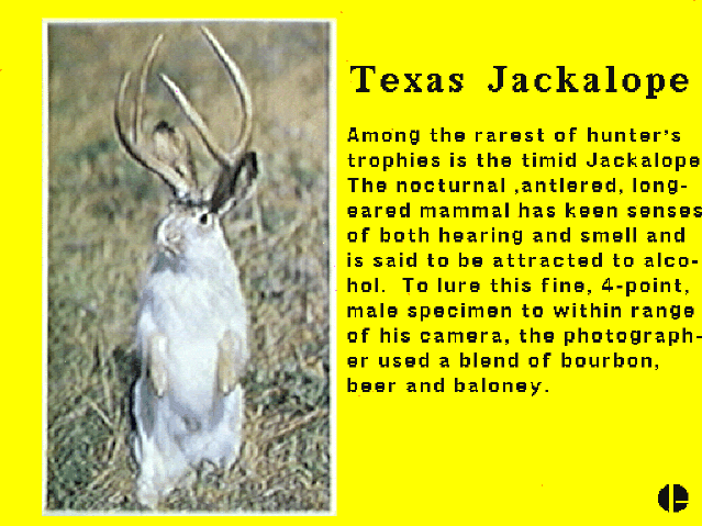 | TEXASJ.GIF | 08-21-1991 | 87k | A GIF of a RARE photo of a TEXAS JACKALOPE! |